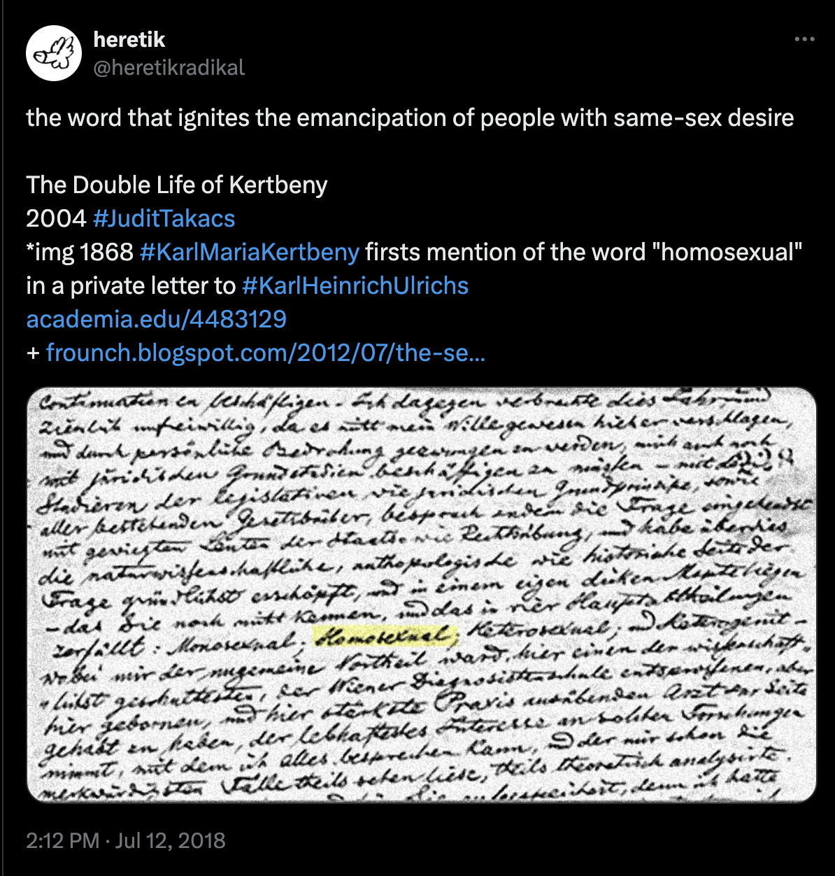 Para abogar en ese sentido, Kertbeny buscó un lenguaje que abordara directamente las leyes que no tomaban en cuenta a las personas tan vulnerables. Se centró en el comportamiento sexual más que en la identidad porque el gobierno criminalizaba los actos sexuales, no el sentido de identidad de las personas o sus deseos internos. En una carta escrita a Ulrichs el 6 de mayo de 1868, Kertbeny inventó los términos homosexual y heterosexual.[1]