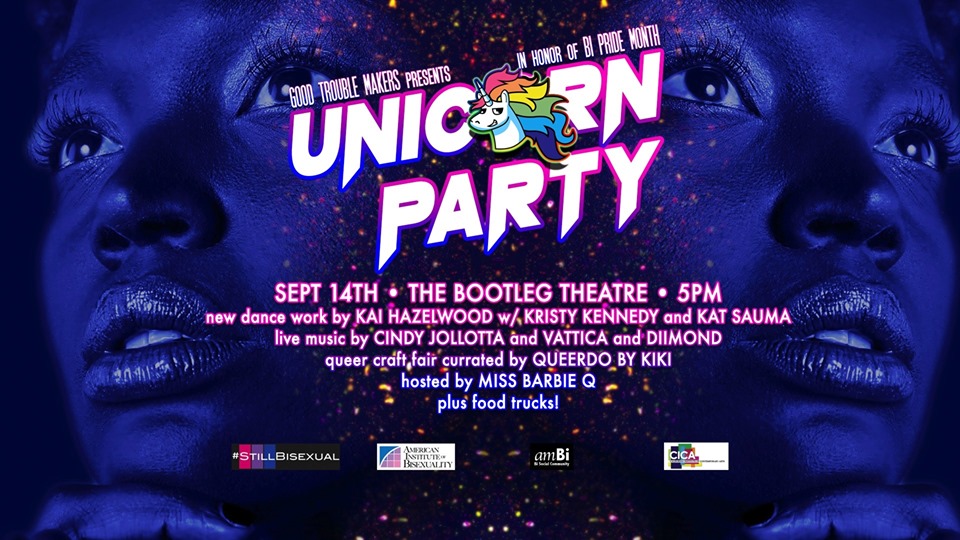 Entonces Unicorn PARTy es una parte de espectáculo de danza y teatro, una parte de música en vivo, con algunos de los mejores y más increíbles músicos bi de L.A., incluidos Vattica y Cindy Jollotta. También habrá un mercado de artesanía queer curado por Queerdo by Kiki, quien es un miembro increíble de amBi. Así que realmente se centra en las personas bi y nos da la oportunidad de reunirnos y divertirnos.