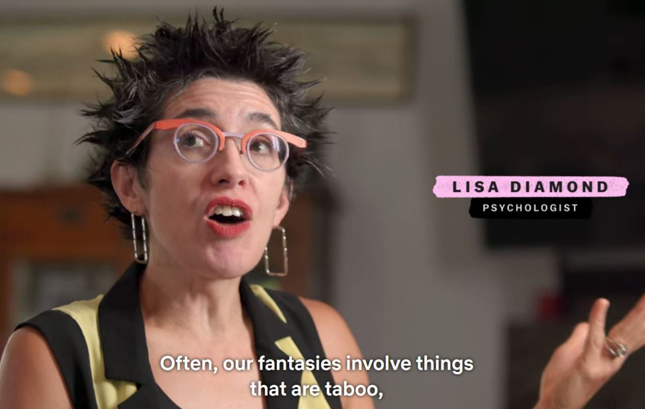 The episode also introduces us to the new web series Mercy Mistress, created by BDSM educator and practitioner Yin Q. The series is based on Q’s experiences as a queer, Asian American dominatrix, and is also produced by Cho. Sex, Explained also emphasizes that having certain fantasies does not mean that one wants to actually engage in those behaviors, such as forced sex. Psychologist Lisa Diamond, known for her work on sexual fluidity, reassures viewers that even if you fantasize about being raped that doesn’t mean you want to be raped in real life.