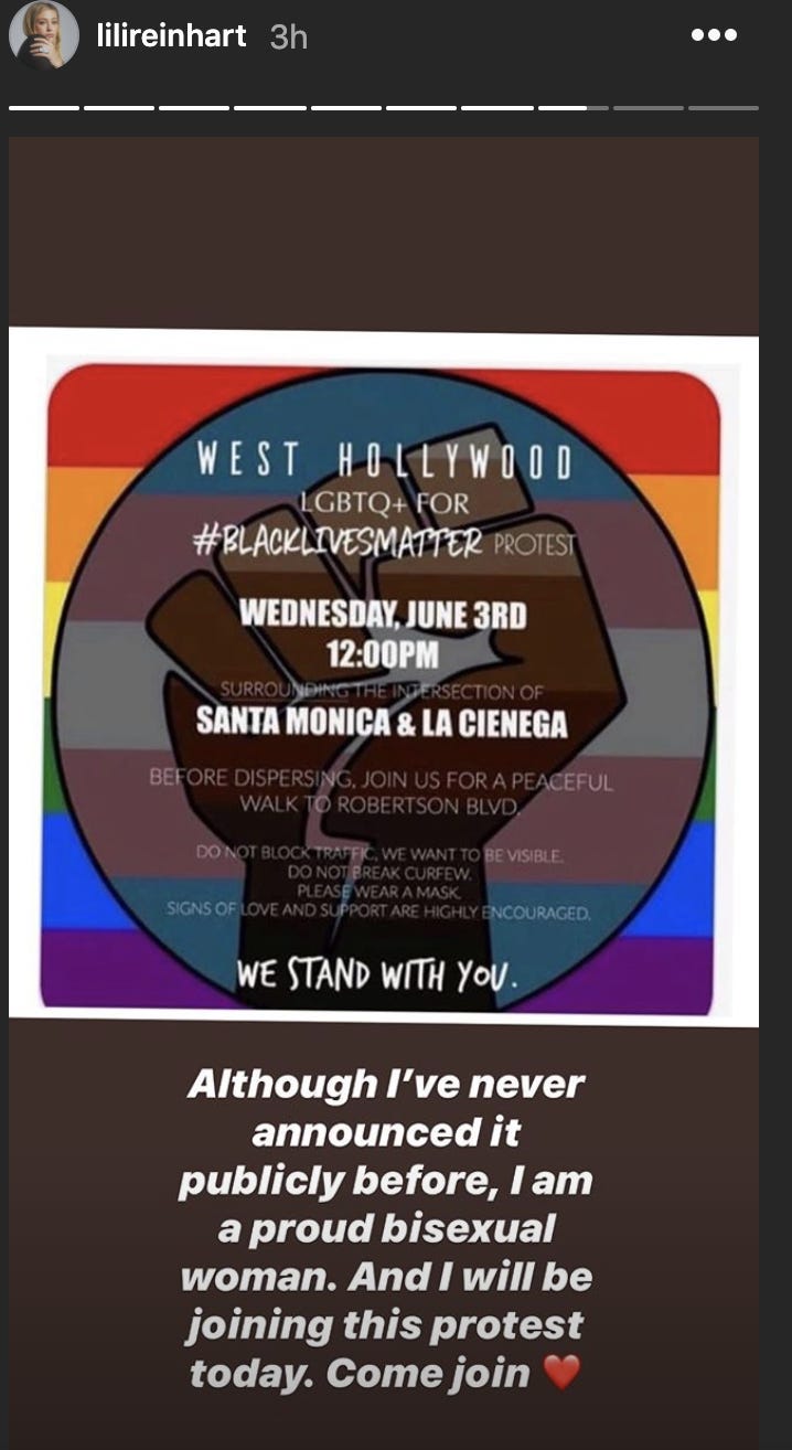 In 2020 Reinhart came out as bi on her Instagram stories.