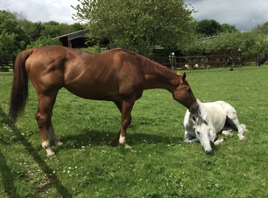 Además del comportamiento sexual, los caballos tienen la capacidad de formar vínculos sociales muy estrechos con individuos del mismo sexo. En 2017, la historia — tan conmovedora como trágica — de dos caballos de carreras premiados llamados Simonsig y Triolo D’Alene se volvió viral. Se encariñaron de inmediato, desarrollando un nivel de cercanía e intimidad que su entrenador, con años de experiencia, nunca había visto. Estaban siempre juntos: caminaban juntos, comían juntos, dormían juntos e incluso se acurrucaban. Su entrenador describió la relación como “dos chicos que se enamoraron”. Luego, trágicamente, Simonsig se rompió una pata trasera durante una carrera y tuvo que ser sacrificado. Es difícil saber si Triolo D’Alene experimentó duelo o en qué medida, pero llegaron cartas y mensajes de apoyo de todas partes.